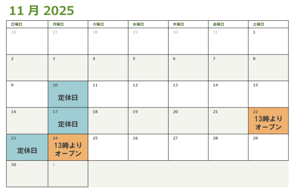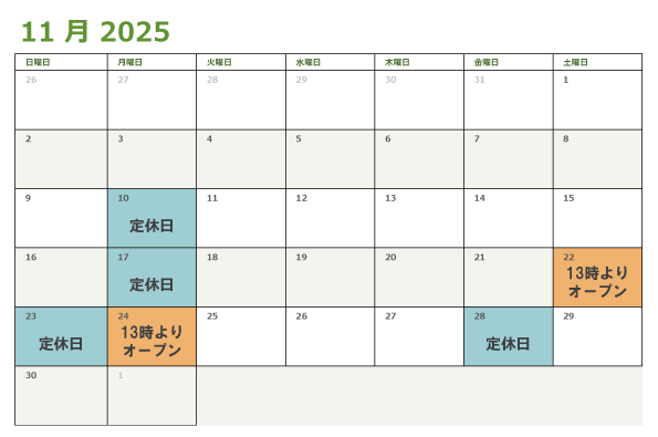 | (定休日は最新情報下のカレンダーでご確認ください。) | ||||||